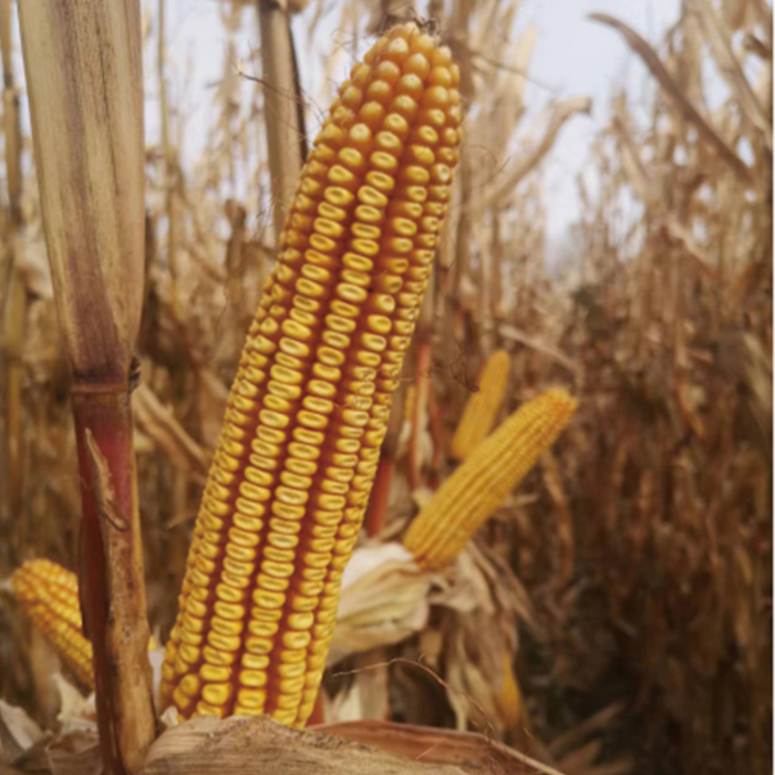 普通玉米品種。在適應(yīng)區(qū)出苗至成熟生育日數(shù)為122天左右,需≥10°C活動積溫2500°C左右。該品種幼苗期第- -葉鞘紫色,葉片深綠色,莖綠色。株高285厘米,穗位高112厘米,成株可見16片葉。果穗圓錐型,穗軸紅色,穗長20.9厘米,穗粗4.9厘米,穗行數(shù)14~16行,籽粒馬齒型、黃色,百粒重40.6克。兩年品質(zhì)分析結(jié)果:容重759~767克/升,粗淀粉72.85%~75.35%,粗蛋白11.52%~11. 54%,粗脂肪3.17%~3.78%。三年抗病接種鑒定結(jié)果:中感至感(5+~7)大斑病,絲黑穗病發(fā)病率11.1%~23.8%,莖腐病發(fā)病率2.3%~5.6%。
